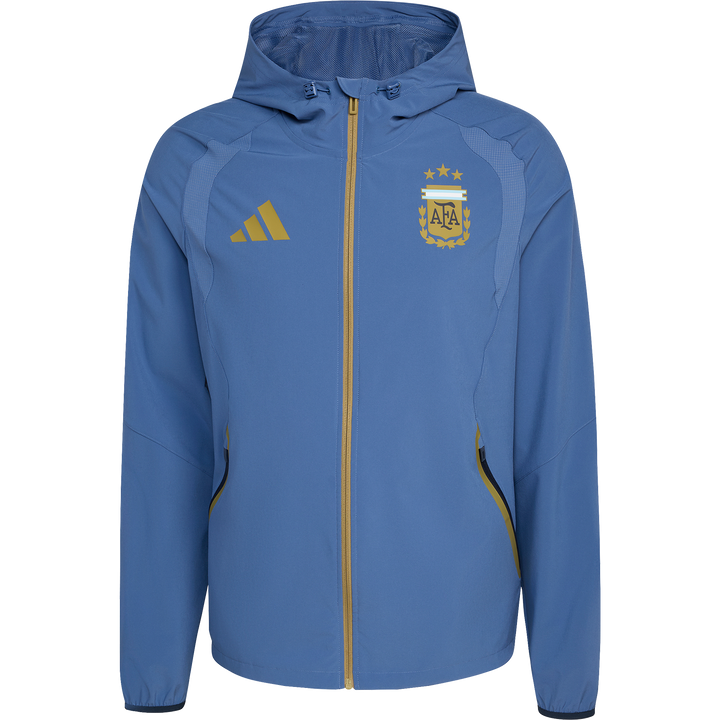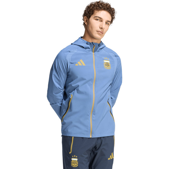 The Argentina Tiro Travel Full Zip windbreaker merges football fit with modern function. Inspired by performance silhouettes, it brings a clean, technical edge to streetwear rooted in sport. Made from durable plain weave fabric, it features a slim profile that layers easily. The full zip and adjustable hood offer flexibility in shifting conditions—designed to move with you. Ergonomic cutlines support natural mobility, while adidas branding and the AFA crest bring signature identity. A versatile piece built to handle travel and changeable weather in style.